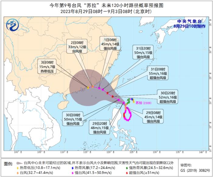 大風預(yù)報:8月29日14時至30日14時,巴士海峽、臺灣海峽、臺灣以東洋面偏南海域?qū)⒂?-8級、陣風9-10級的大風,其中巴士海峽海域風力可達9-10級,部分海域風力可達11-13級,「蘇拉」中心經(jīng)過的附近海面的風力有14-16級、陣風17級及以上,請過往船隻注意航行安全。
