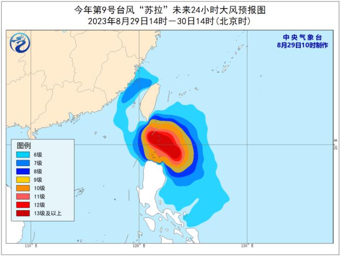 據(jù)中央氣象臺網(wǎng)站消息,中央氣象臺8月29日10時發(fā)布颱風藍色預(yù)警:今年第9號颱風「蘇拉」(SAOLA)(強颱風級)的中心今天(29日)上午8點鐘位於臺灣鵝鑾鼻東南方向大約460公里的海面上,就是北緯18.6度、東經(jīng)123.5度,中心附近最大風力有14級(45米/秒),中心最低氣壓為950百帕,七級風圈半徑220-250公里,十級風圈半徑80-90公里,十二級風圈半徑50公里。