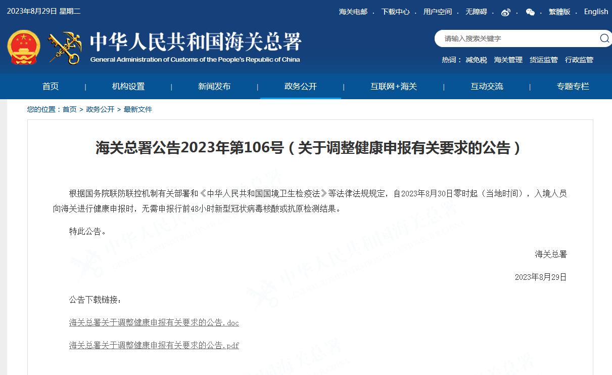 據(jù)海關(guān)總署網(wǎng)站29日消息,根據(jù)國務(wù)院聯(lián)防聯(lián)控機制有關(guān)部署和《中華人民共和國國境衛(wèi)生檢疫法》等法律法規(guī)規(guī)定,自2023年8月30日零時起(當(dāng)?shù)貢r間),入境人員向海關(guān)進(jìn)行健康申報時,無需申報行前48小時新型冠狀病毒核酸或抗原檢測結(jié)果。