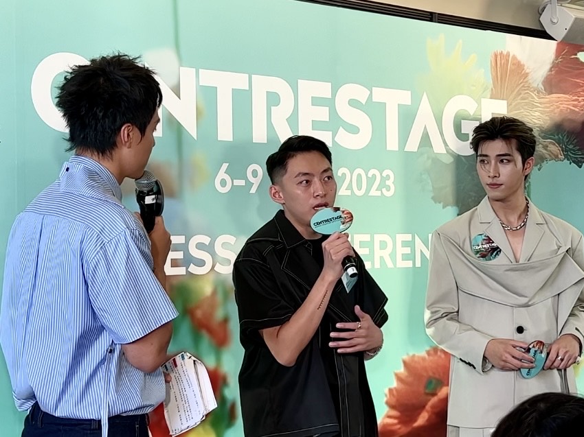 藝人Phoebus(吳啟洋)(右)及Brian(陳安立)(左)穿上由香港設計師Wilson Choi(蔡鴻成) (中)打造的REDEMPTIVE服裝出席CENTRESTAGE新聞發(fā)布會。