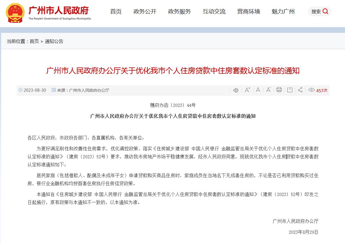 據(jù)廣州市人民政府網(wǎng)站消息,30日廣州市人民政府辦公廳發(fā)布關(guān)於優(yōu)化廣州市個人住房貸款中住房套數(shù)認定標準的通知。