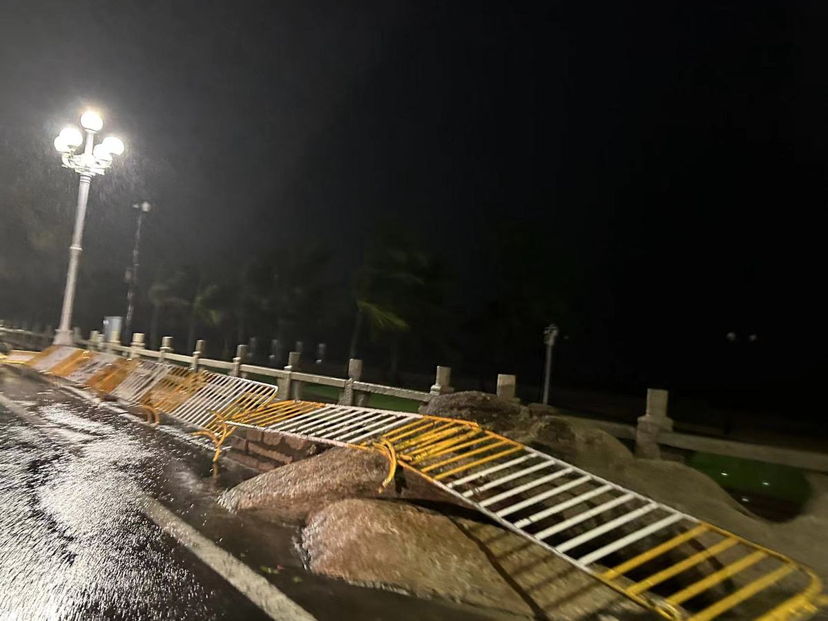 記者注意到,沿途很多綠化樹木明顯已經(jīng)經(jīng)過修剪,沒有了「樹大招風(fēng)」,只有少數(shù)枝幹被吹落到路面。半島四路與情侶北路交匯處,有工地倒伏的欄桿和圍擋,現(xiàn)場工作人員正頂風(fēng)冒雨抓緊清理以免誘發(fā)更多危險。