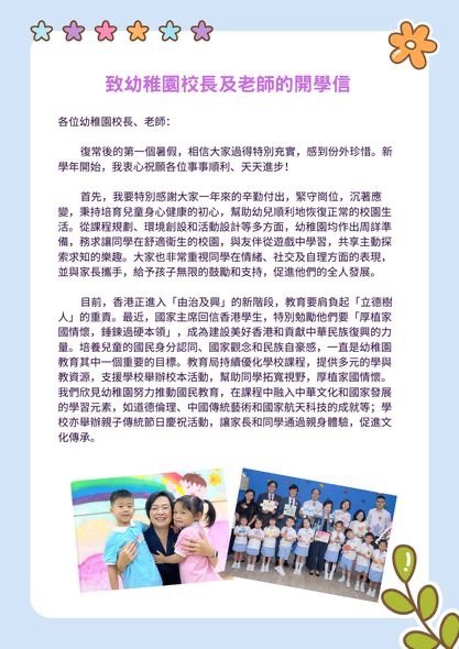 教育局局長(zhǎng)蔡若蓮今日(2日)在社交平臺(tái)上載兩封分別致中小學(xué)校長(zhǎng)及老師與幼稚園校長(zhǎng)及老師的開(kāi)學(xué)信,祝願(yuàn)各位事事順利、天天進(jìn)步。