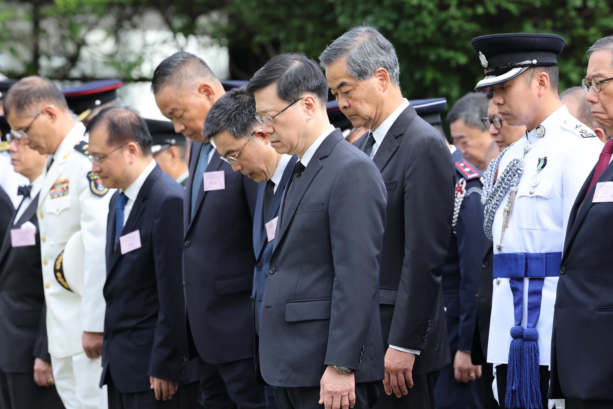 行政長官李家超和政府高層官員今早出席儀式。紀(jì)念儀式包括奏唱國歌、升旗禮、警察步槍儀仗隊(duì)鳴槍致敬、全體出席者默哀及鞠躬致敬。