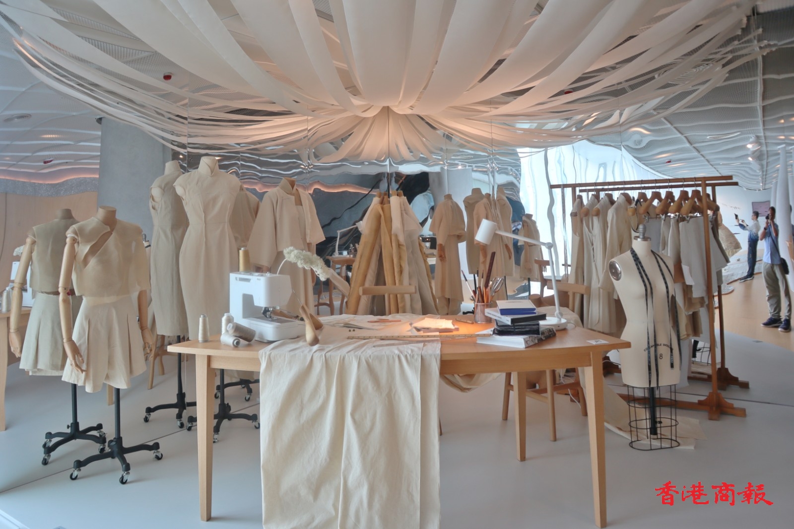 為配合展覽,香港藝術家林春菊在展廳外創(chuàng)作全新場域特定裝置作品《那時——彼岸》,以時裝設計視點出發(fā),在館內打造一個穿梭過去、當下、未來的工作室,並展示全新的服裝作品,重塑經典。(馮瀚文攝)