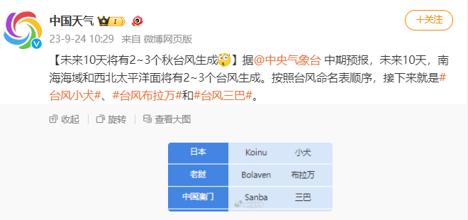 據(jù)@中央氣象臺(tái) 中期預(yù)報(bào),今起10天南海海域和西北太平洋面將有2~3個(gè)颱風(fēng)生成。