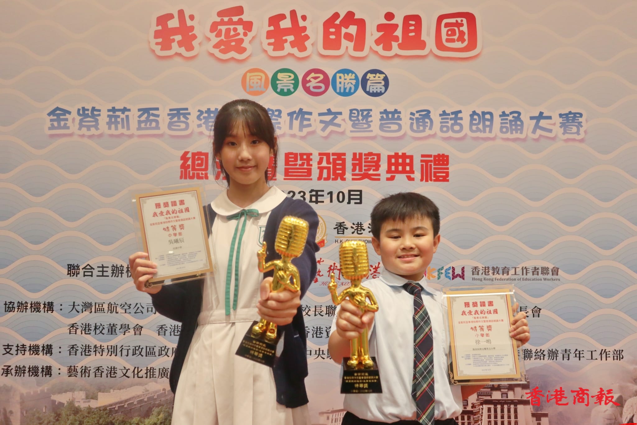 由香港潮州商會主辦的第二屆「我愛我的祖國」香港校際作文暨普通話朗誦大賽總決賽暨頒獎典禮,今日(7日)於香港故宮文化博物館舉行。全港近百間中小學(xué)各推薦一名學(xué)生參賽,經(jīng)過3個月多場選拔至昨天終誕生中、小學(xué)組各1名特等獎、4名一等獎、9名二等獎、13名三等獎及22名優(yōu)秀獎,特等至三等獎學(xué)生可獲大灣區(qū)航空公司頒贈來回臺灣機(jī)票一張。小學(xué)組特等獎得主為保良局林文燦英文小學(xué)徐一嗚,中學(xué)組特等獎得主為培僑中學(xué)吳曦辰。