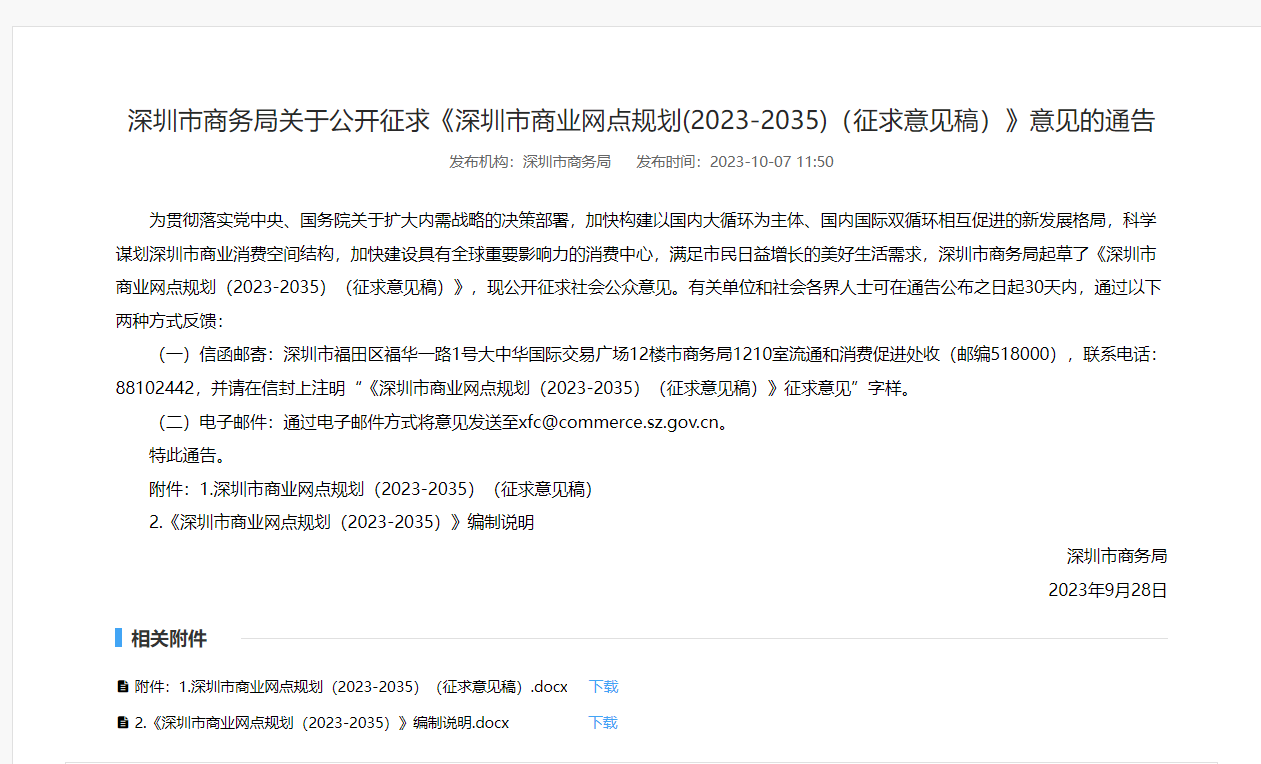 深圳正在全力打造「具有全球影響力的消費中心」。近日,深圳市商務(wù)局在其官網(wǎng)上公布了《深圳市商業(yè)網(wǎng)點規(guī)劃(2023-2035)(徵求意見稿)》(以下簡稱「規(guī)劃」),公開徵求社會公眾意見。