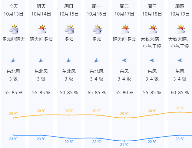 ? 今日(13日)多雲(yún)間晴天;氣溫23-29℃;東北風(fēng)3級(jí);相對(duì)濕度55%-85%。