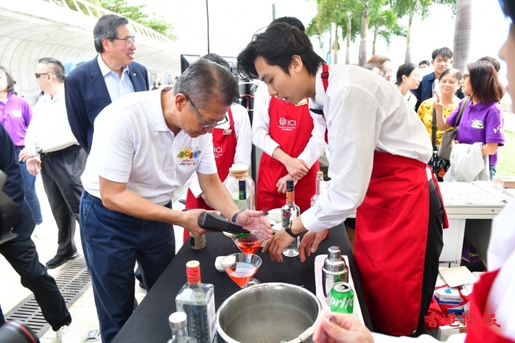 財政司司長陳茂波在「星級料理坊」區(qū)域示範調配「五感分子雞尾酒」,利用分子料理技巧和科學方法調製具獨特香氣和煙霧的特飲。