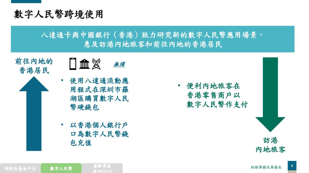 如獲監(jiān)管機(jī)構(gòu)批準(zhǔn)和技術(shù)上準(zhǔn)備就緒,財庫局歡迎八達(dá)通推展下一步計劃,擬訂方便訪港內(nèi)地旅客在香港使用數(shù)字人民幣的解決方案,讓他們透過旅客流動應(yīng)用程式以數(shù)字人民幣為八達(dá)通卡充值。