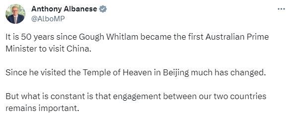 阿爾巴尼斯在社交媒體上發(fā)布了多張參觀天壇的照片,並發(fā)文稱,「50年前,高夫·惠特拉姆成為首位訪華的澳大利亞總理。自從他參觀北京的天壇以來,已經(jīng)發(fā)生了很大變化。但不變的是,我們兩國之間的接觸仍然很重要?!?/p>