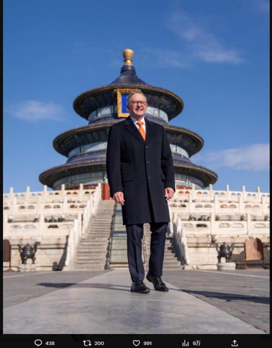 北京時間6日,正在中國進(jìn)行訪問的澳大利亞總理安東尼·阿爾巴尼斯在社交媒體上發(fā)布了自己參觀天壇的照片,並發(fā)文談澳中關(guān)係。