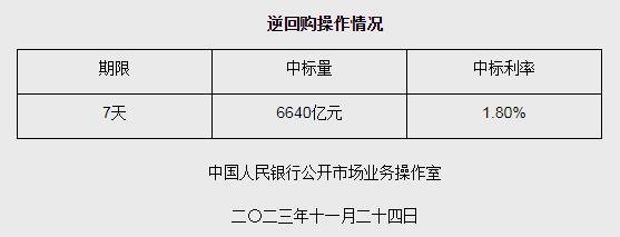 據(jù)央行網(wǎng)站消息,為維護(hù)月末流動(dòng)性平穩(wěn),2023年11月24日人民銀行以利率招標(biāo)方式開展了6640億元逆回購操作,中標(biāo)利率1.80%,期限為7天。具體情況如下: