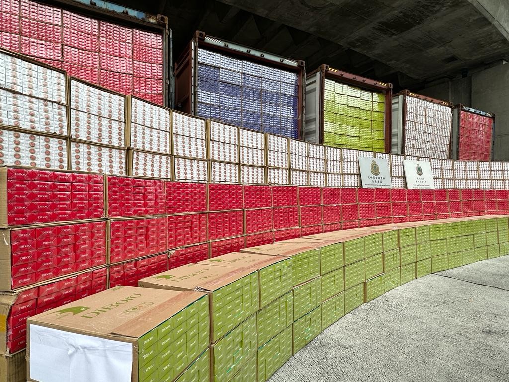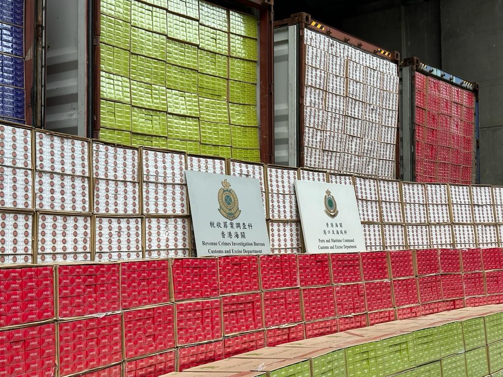海關稅收罪案調查科稅收調查第一組高級調查主任林威杰今日(29日)表示,人員15日在葵涌貨櫃碼頭鎖定一個由臺灣抵港、報稱載有塑膠板的40呎貨櫃,經檢查後在貨櫃內搜出930萬支私煙。在同日在屯門內河碼頭一個由廣州抵港、報稱載有花盤和燈飾的40呎貨櫃中再搜出160萬支私煙。