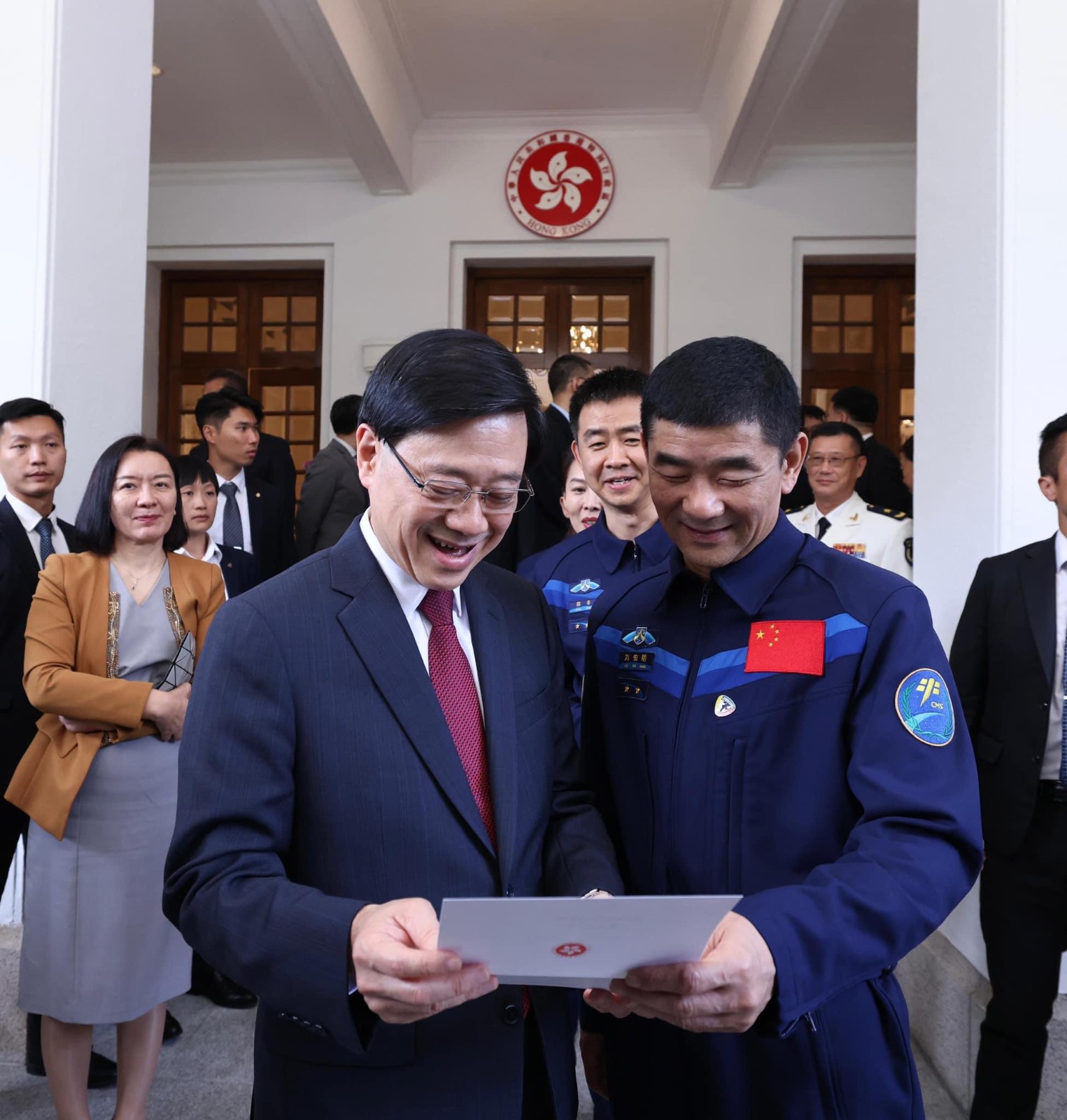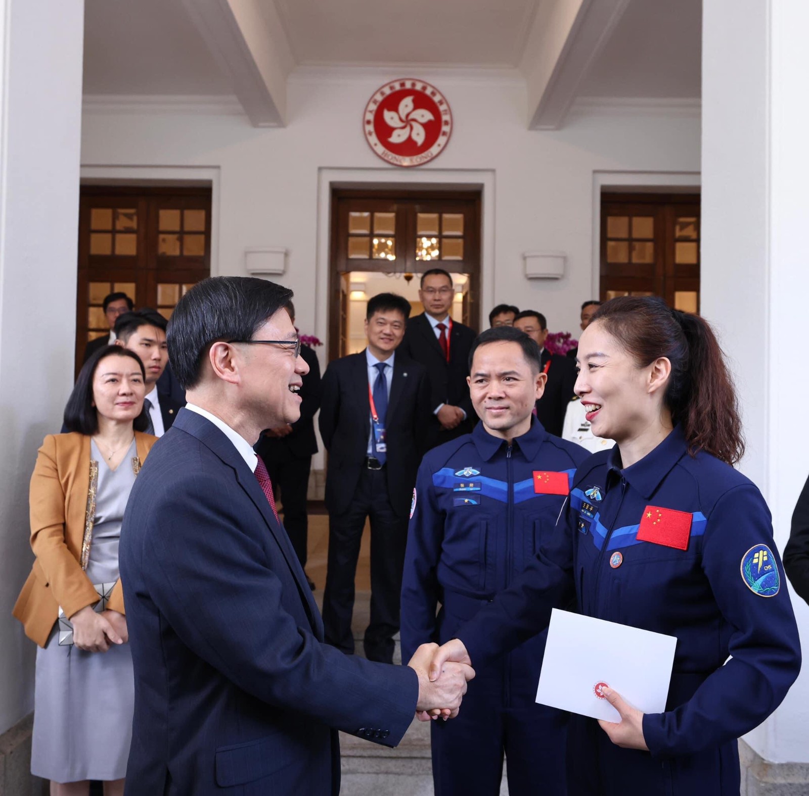 行政長(zhǎng)官李家超(右三)、中國(guó)載人航天工程代表團(tuán)團(tuán)長(zhǎng)林西強(qiáng)(左三)、神舟十二號(hào)乘組航天員劉伯明(右二)、神舟十三號(hào)乘組航天員王亞平(右一)、神舟十四號(hào)乘組指令長(zhǎng)陳冬(左二)和神舟十五號(hào)乘組航天員張陸(左一)出席歡送儀式前合照。圖源政府新聞處