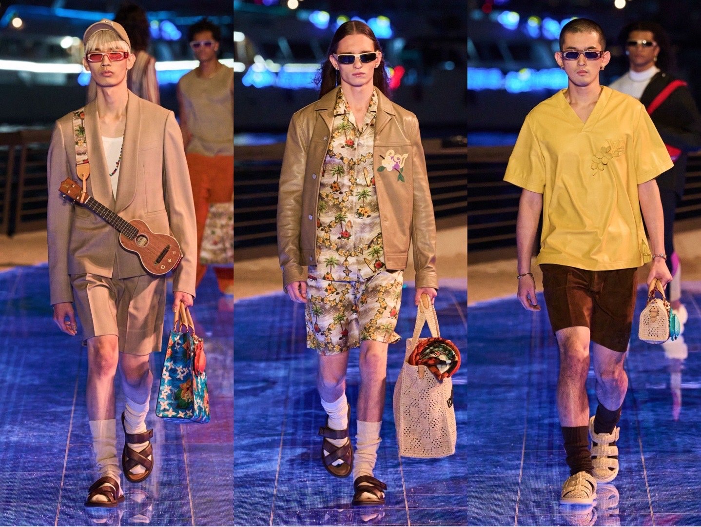 今季男裝與上一季相比大幅削減了標誌性的棋盤格與老花元素,從嚴肅著裝轉(zhuǎn)向更為年輕的款式剪裁,以及更加花俏的設(shè)計裝飾。豐富多樣的夏威夷風(fēng)情和海洋元素融入服裝設(shè)計中,如潛水服、沖浪服等,讓整個系列散發(fā)出一股度假的閒適氣氛,令觀眾恍如置身於夏威夷的美麗海灘。
