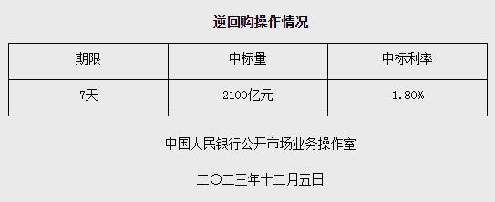 據(jù)央行網(wǎng)站消息,為維護(hù)銀行體系流動性合理充裕,2023年12月5日人民銀行以利率招標(biāo)方式開展了2100億元逆回購操作,中標(biāo)利率1.80%,期限為7天。具體情況如下: