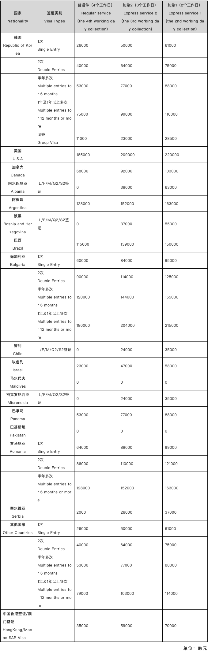 據(jù)中國駐韓國大使館公眾號消息,12月7日,中國駐韓國大使館發(fā)布通知,為便利中外人員往來,自2023年12月11日至2024年12月31日,中國駐韓使領(lǐng)館對赴華簽證規(guī)費(fèi)進(jìn)行調(diào)減。對12月11日前已受理的簽證申請,按原標(biāo)準(zhǔn)收費(fèi)。調(diào)減後的簽證規(guī)費(fèi)表如下: