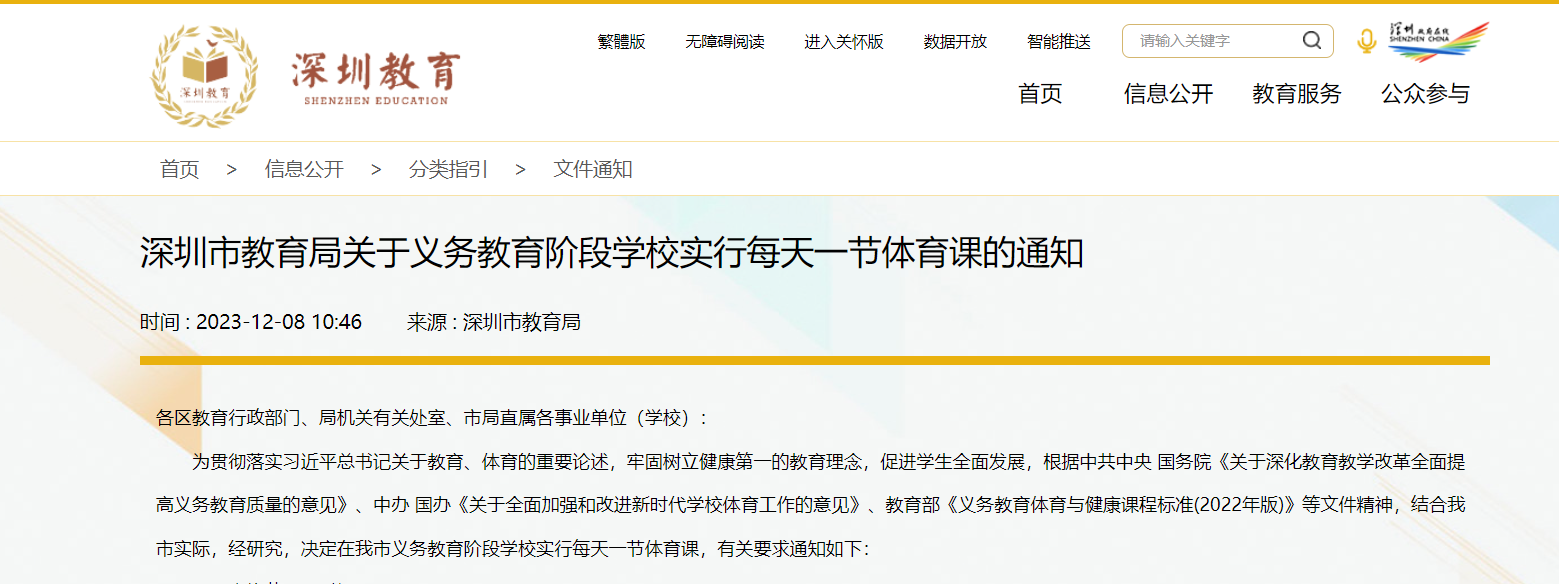 日前,深圳市教育局制定了《深圳市加強和改進(jìn)學(xué)校體育工作的實施意見》,《實施意見》提出,義務(wù)教育階段學(xué)校將實行每天一節(jié)體育課。義務(wù)教育階段每天一節(jié)體育課政策何時實施?深圳市教育局發(fā)布《關(guān)於義務(wù)教育階段學(xué)校實行每天一節(jié)體育課的通知》,明確深圳市義務(wù)教育階段所有公、民辦學(xué)校,從2024年春季學(xué)期開始實行每天一節(jié)體育課。各義務(wù)教育階段學(xué)校要將每天一節(jié)體育課編入課表,並實行備案制度,不得以大課間活動、非全體學(xué)生參與的特色課興趣課、課後延時服務(wù)等替代體育課。