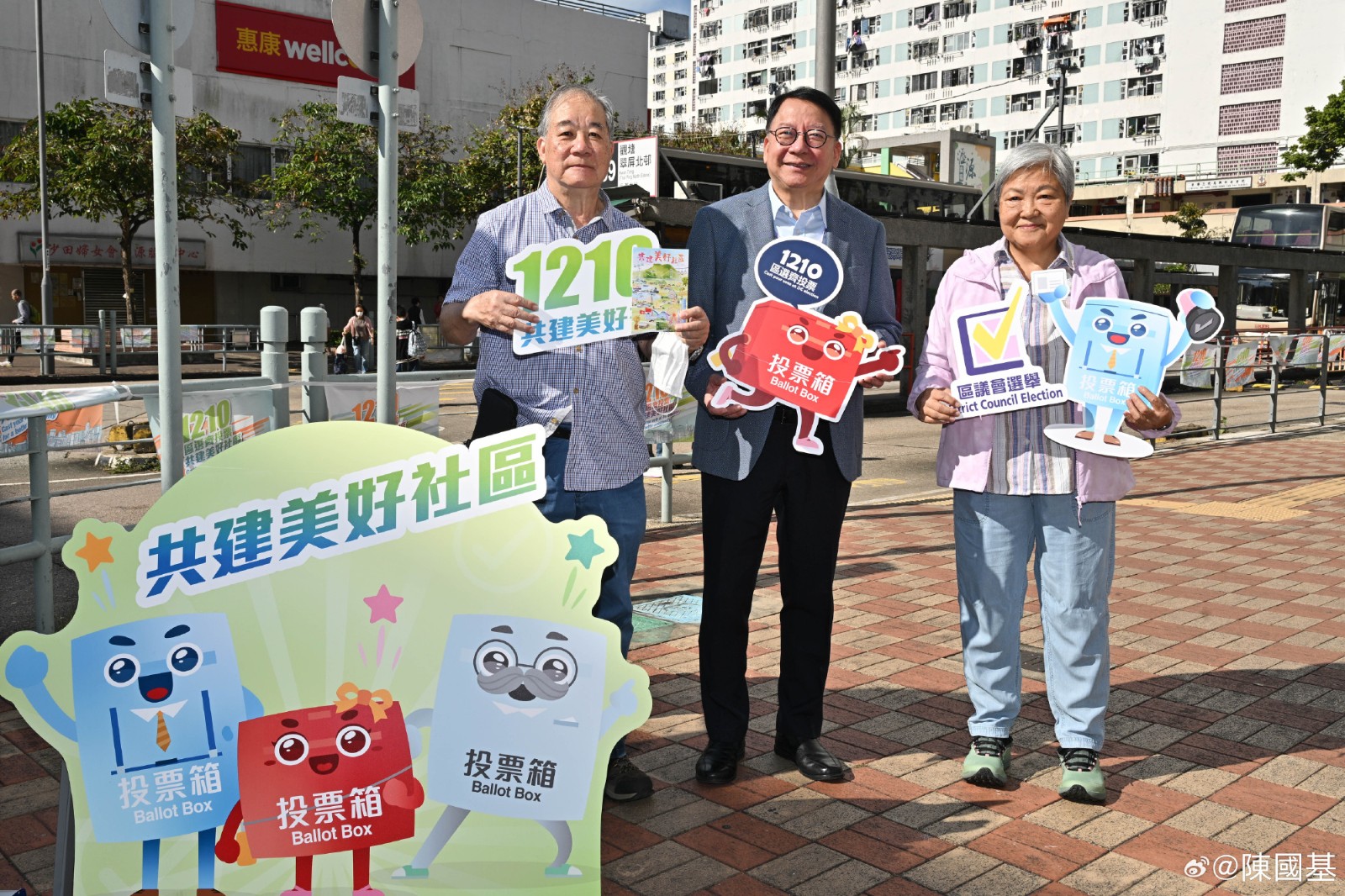 陳國基又到票站外的指定「打卡」位,與市民跟選舉吉祥物「票箱寶寶」合影,響應(yīng)為這次區(qū)選設(shè)立的貼心留念新安排?!肝疑钚湃?00多個票站的同事會繼續(xù)全力以赴,辦好今次選舉,發(fā)揮政府一貫專業(yè)高效精神。我也再次呼籲廣大選民,在今晚10點半前,把握時間到所屬票站,投下你的神聖一票,選出你的心水區(qū)議員,貼心為市民福祉、為社區(qū)建設(shè)、為香港未來奮鬥打拼!」