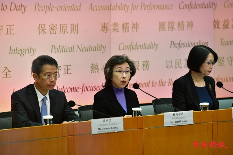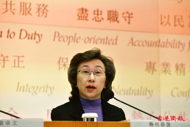 公務(wù)員事務(wù)局局長(zhǎng)楊何蓓茵13日主持記者會(huì),公布更新《公務(wù)員守則》諮詢稿。(記者 崔俊良攝)