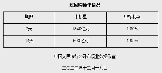 據(jù)央行網(wǎng)站消息,為維護(hù)年末流動性合理充裕,2023年12月18日人民銀行以利率招標(biāo)方式開展了2440億元7天期和14天期逆回購操作。具體情況如下:
