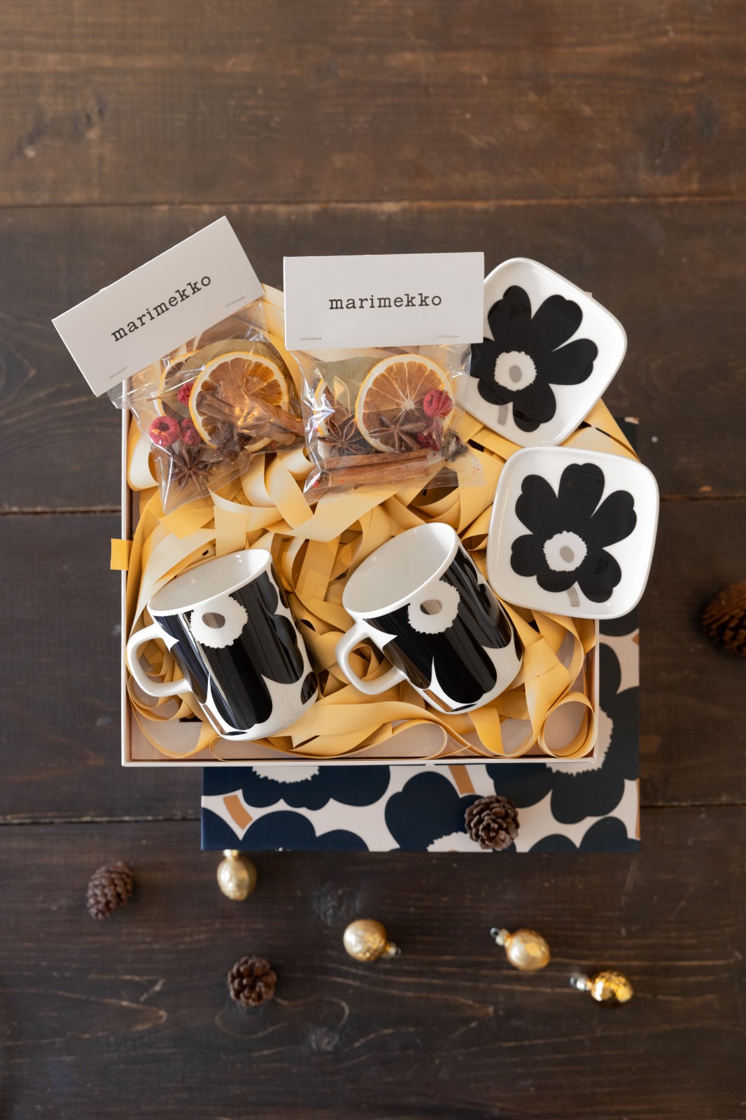 品牌並推出節(jié)日限定禮盒套裝,外包裝是深藍(lán)搭配燙金的UNIKKO印花,內(nèi)有一對UNIKKO或KUUSIKOSSA印花的馬克杯和碟子套裝,限量附送芬蘭傳統(tǒng)聖誕熱飲Mulled wine spice兩份。