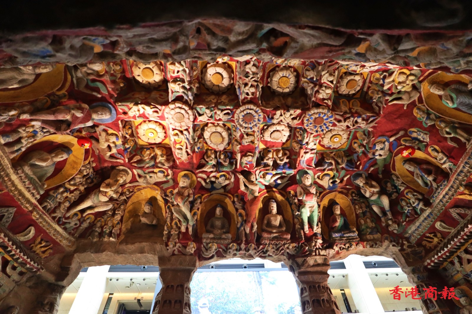 最為吸引的要算是坐落在大堂中央、高達(dá)9米的雲(yún)岡第12窟(複製窟)。這個(gè)石窟建造於公元470—494年,是因彩繪異常絢麗而得名的雲(yún)岡「五華洞」之一。其前室雕刻了眾多演奏各類樂器的伎樂天人形象,又被譽(yù)為「音樂窟」,可以說是中國古代最早的宮廷交響樂團(tuán)。洞窟前堂後室的形制,既反映了北魏平城時(shí)代的宮殿建築面貌,也揭示了佛寺建築對(duì)宮殿建築的模擬。