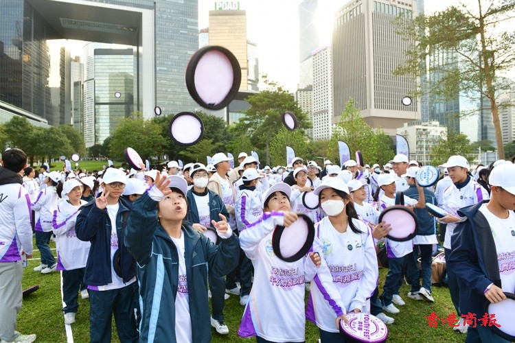 中國香港新興運動協(xié)會及青年廣場為響應(yīng)政府「青年節(jié)@HK」口號「正向新世代˙未來更『青』彩」,於今日(20日)在金鐘夏慤道添馬公園舉辦「飛越未來」千人齊飛躲避盤活動,與來自16間不同學(xué)校及機構(gòu)的青年人一起刷新「最大規(guī)模的飛盤課堂」健力士世界紀(jì)錄及參與1000人同時飛躲避盤的壯舉,民政及青年事務(wù)局副局長梁宏正到場主禮,見證盛事刷新世界紀(jì)錄一刻。(崔俊良攝)