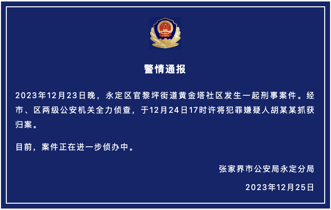 張家界市公安局永定分局12月25日通報(bào),12月23日晚,永定區(qū)官黎坪街道黃金塔社區(qū)發(fā)生一起刑事案件。經(jīng)市、區(qū)兩級(jí)公安機(jī)關(guān)全力偵查,於12月24日17時(shí)許將犯罪嫌疑人胡某某抓獲歸案。目前,案件正在進(jìn)一步偵辦中。