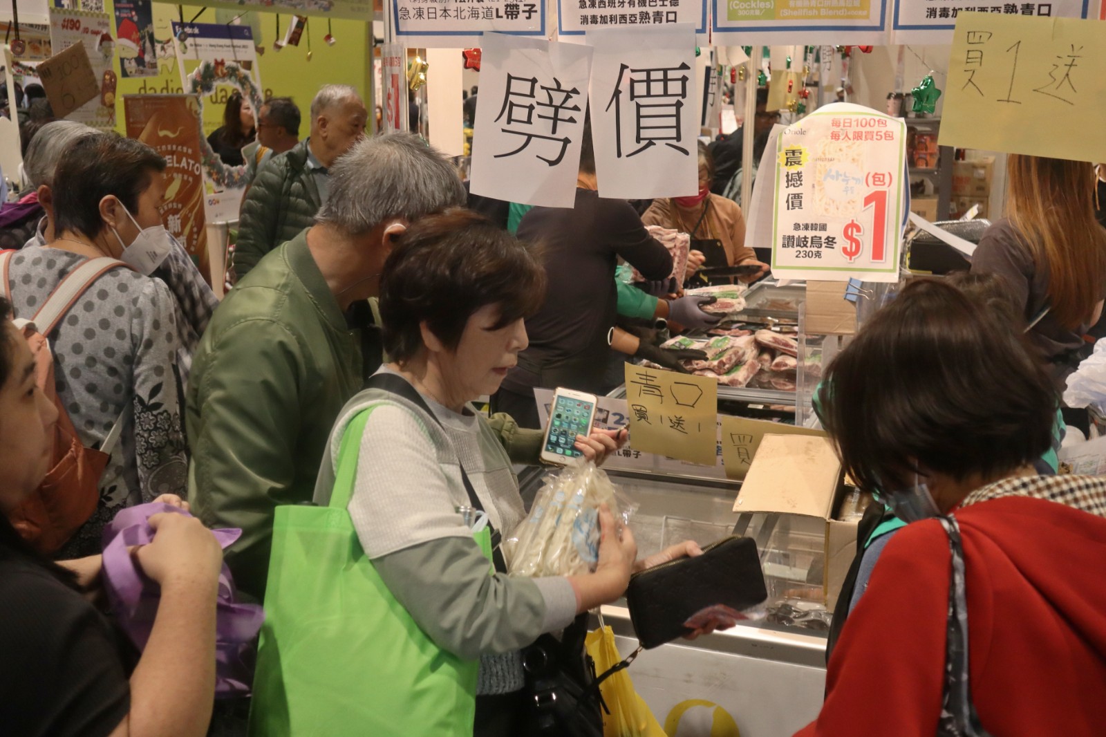 一連五天的「香港冬日美食節(jié)」今天(27日)是最後一天,不少攤檔減價促銷,吸引市民入場搶購。中午過後入場的市民絡(luò)繹不絕,場內(nèi)人頭湧湧。促銷貨品如:一元一包的烏冬、十元一包的火雞翼、十二元一排的日本蛋、一百元八大條的牛肉腸、買紅酒送啤酒等,成為市民的搶手貨,不少市民拉著購物車、大包小包,滿載而歸。(馮瀚文攝)
