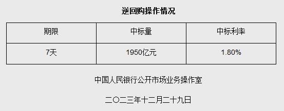 據(jù)央行網(wǎng)站消息,為維護(hù)年末流動(dòng)性合理充裕,2023年12月29日人民銀行以利率招標(biāo)方式開展了1950億元逆回購操作,期限為7天,中標(biāo)利率1.80%。