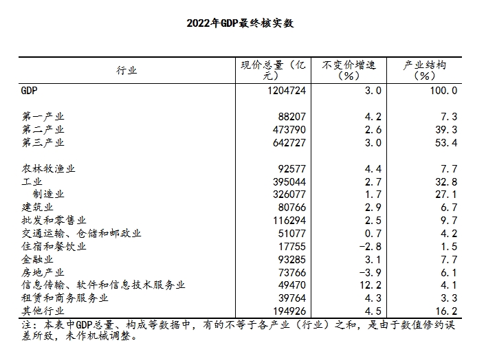 國家統(tǒng)計局:經最終核實,2022年GDP現(xiàn)價總量為1204724億元