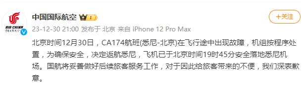 國航悉尼至北京航班飛行途中出現(xiàn)故障返航,國航致歉