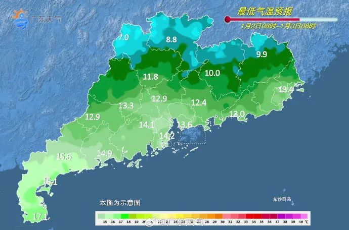 2日,粵北和珠三角北部多雲(yún)到陰天,有分散小雨,其餘地區(qū)多雲(yún)。早晨最低氣溫:粵北、粵東的北部山區(qū)市縣9℃~11℃,粵西市縣15℃~18℃,其餘市縣12℃~15℃。
