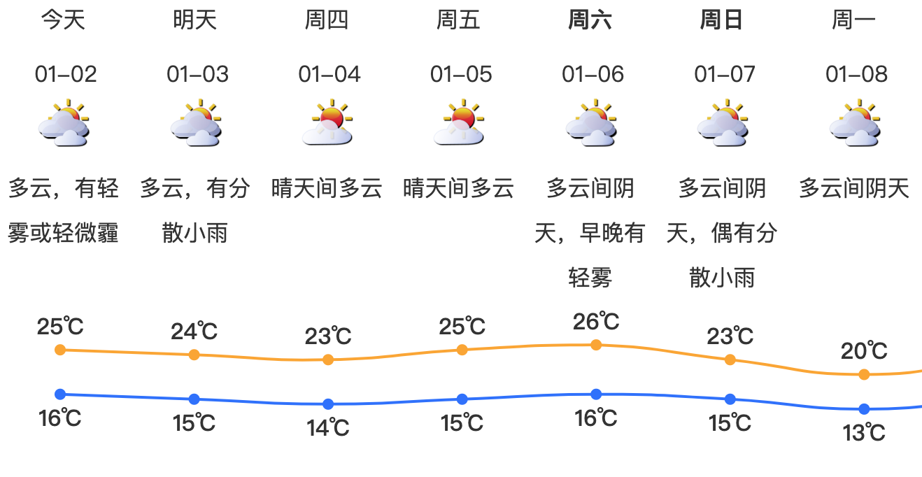 2日大致多雲(yún),天氣溫暖,部分時(shí)間有輕霧或輕微霾;