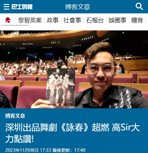 《巴士的報》去年11月刊登的一篇文章,作者在深圳觀看了舞劇《詠春》,表示演出下半場五大門派「過招」引發(fā)全場熱烈掌聲,直呼「這一段高潮迭起、令人目不暇接,每一秒都是『精華』」。作者認為《詠春》的創(chuàng)新很值得香港學習,亦在當時就非常希望《詠春》能來香港演出,希望透過香港這個中外文化藝術(shù)交流中心,讓世界更多人認識我們中國舞臺劇已走在世界級數(shù)。