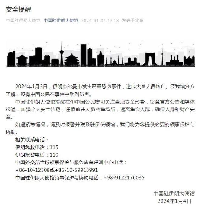 據(jù)中國駐伊朗大使館微信公眾號消息,2024年1月3日,伊朗克爾曼市發(fā)生嚴(yán)重恐襲事件,造成大量人員傷亡。經(jīng)大使館多方了解,沒有中國公民在事件中受到傷害。