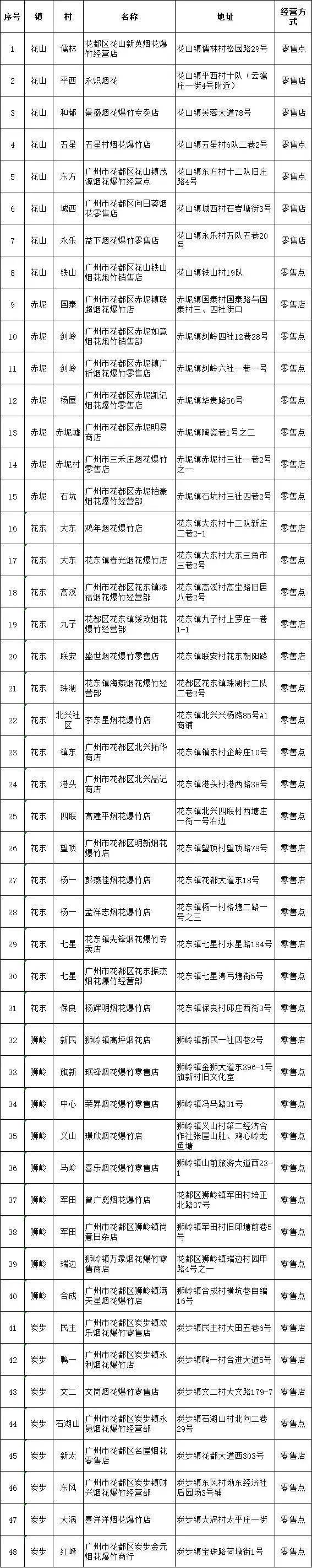 與此同時(shí),花都區(qū)將擬符合選址要求的48家煙花爆竹經(jīng)營零售店(點(diǎn))名單予以公示。名單如下: