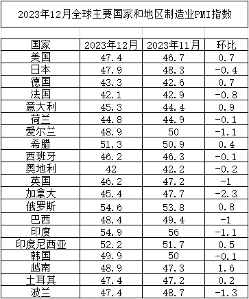 據(jù)中國物流與採購聯(lián)合會消息,2023年12月份全球製造業(yè)PMI為48%,與上月持平,連續(xù)15個月運行在50%以下。2023年,全球製造業(yè)PMI均值為48.5%,較2022年下降3.3個百分點,全年各月均運行在50%以下,全球經(jīng)濟增長勢頭較2022年有所放緩。分區(qū)域看,2023年,亞洲製造業(yè)PMI均值為50.7%,與2022年持平,顯示出較強的增長韌性;非洲製造業(yè)PMI均值為48.8%,較2022年下降1.9個百分點,在全球經(jīng)濟復蘇較弱的影響下,非洲製造業(yè)增速較2022年也有所放緩;美洲製造業(yè)PMI均值為47.5%,較2022年下降5.6個百分點,持續(xù)加息給美國製造業(yè)帶來影響,成為拖累美洲製造業(yè)復蘇的主要因素;歐洲製造業(yè)PMI均值為46.3%,較2022年下降5.6個百分點,顯示在地緣政治衝突和持續(xù)加息的影響下,歐洲製造業(yè)持續(xù)弱勢。