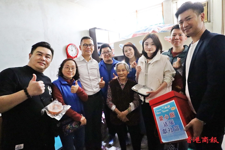 葵青區(qū)議員黃俊揚(yáng)、葵盛東邨小區(qū)關(guān)愛隊(duì)關(guān)愛隊(duì)隊(duì)員李女士、立法會(huì)議員陳恒鑌、贊助商蔣小姐手持飯盒準(zhǔn)備上門探訪長(zhǎng)者。