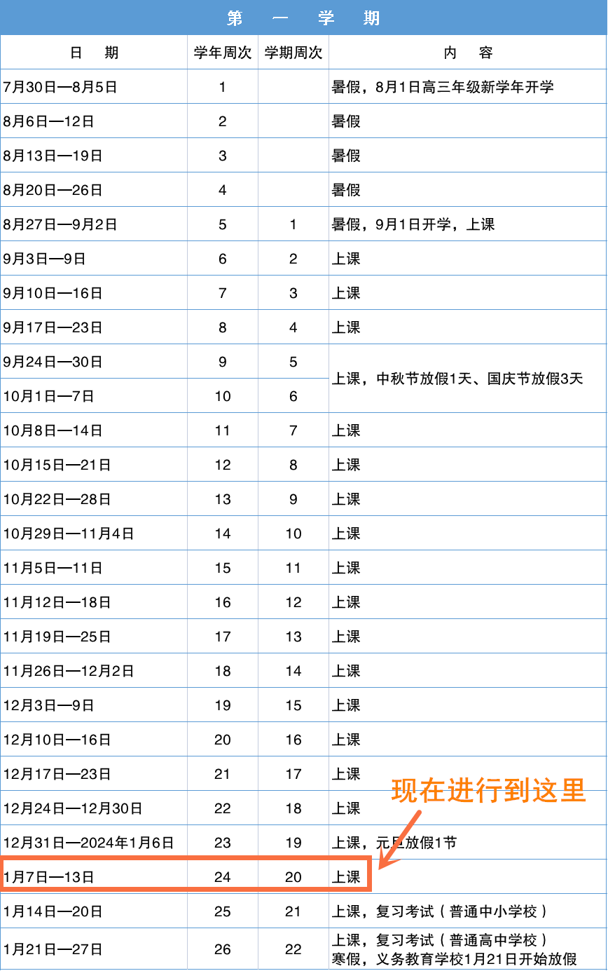 ●第一學(xué)期第1周為2023年8月27日至9月2日,高一、高二年級(jí)開(kāi)學(xué)時(shí)間為9月1日,高三年級(jí)開(kāi)學(xué)時(shí)間為8月1日;寒假開(kāi)始時(shí)間為2024年1月28日;