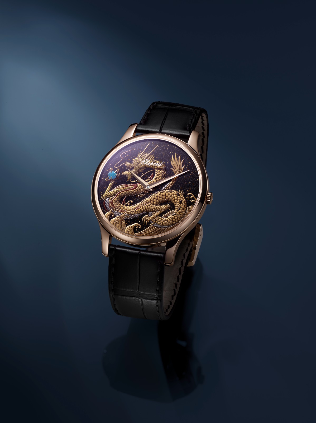 製表時,金藝與漆藝相互融匯相當(dāng)難得,能夠嫻熟掌握這門技藝亦是少有。蕭邦以日本傳統(tǒng)蒔繪工藝呈現(xiàn)神話的祥龍,慶祝農(nóng)曆新年,L.U.C XP龍年蒔繪腕表象徵機(jī)遇與興旺。祥龍是中國神話傳說中最早出現(xiàn)的瑞獸,代表皇權(quán)、財(cái)富與繁盛,亦是吉祥的象徵。腕表從中國傳統(tǒng)文化汲取靈感,採用18K玫瑰金打造的39.5毫米直徑表殼,搭載配備微型擺陀的L.U.C 96.17-L型機(jī)芯,確保腕表厚度不超過6.8毫米。表盤採用日本傳統(tǒng)蒔繪工藝?yán)L製,點(diǎn)綴金粉與以珍珠貝母鑲嵌的圖案裝飾,並且於日本手工繪製完成。