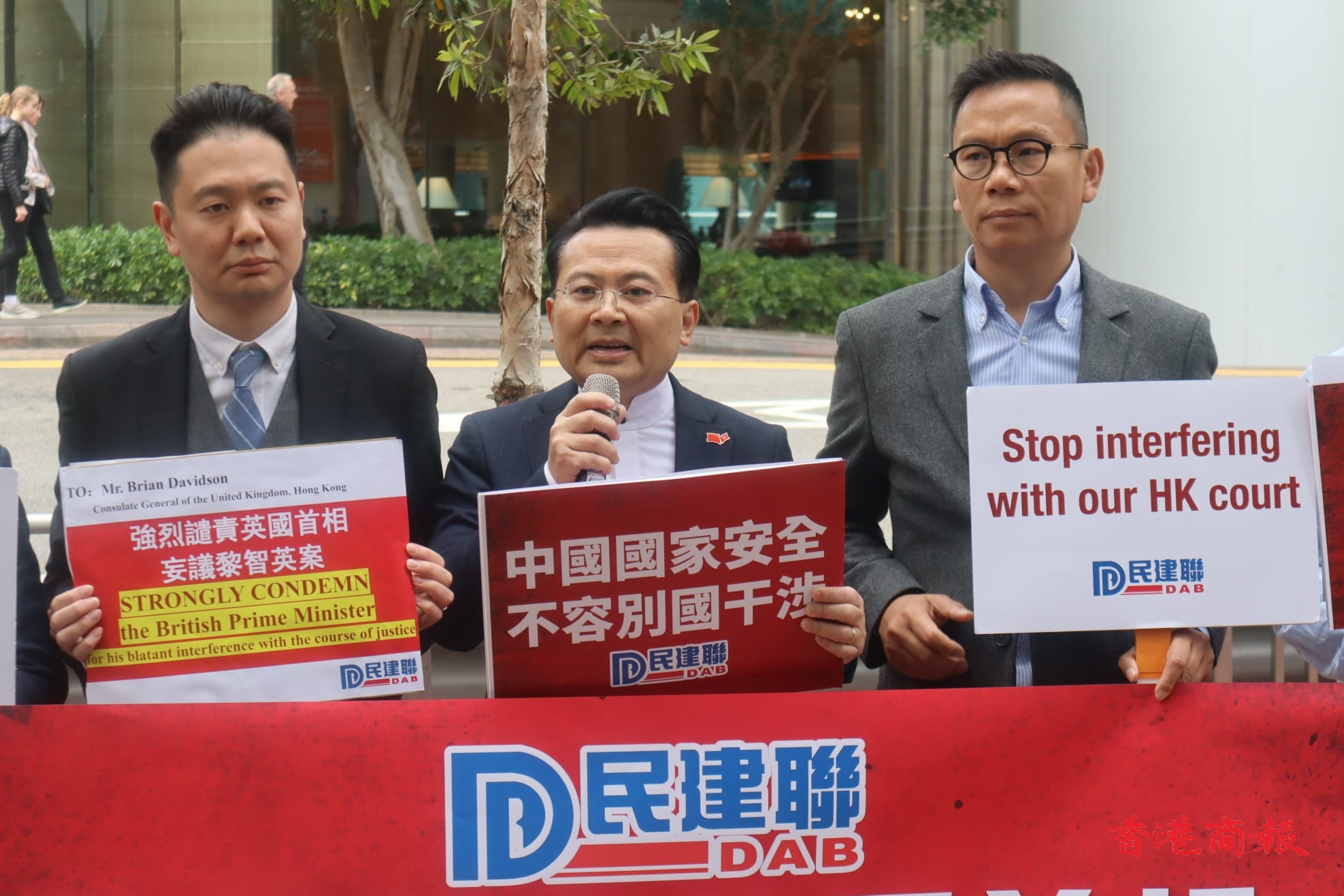 圖說(shuō):民建聯(lián)到英國(guó)駐港總領(lǐng)館抗議英國(guó)首相行徑如同干預(yù)及踐踏香港司法。馮瀚文攝