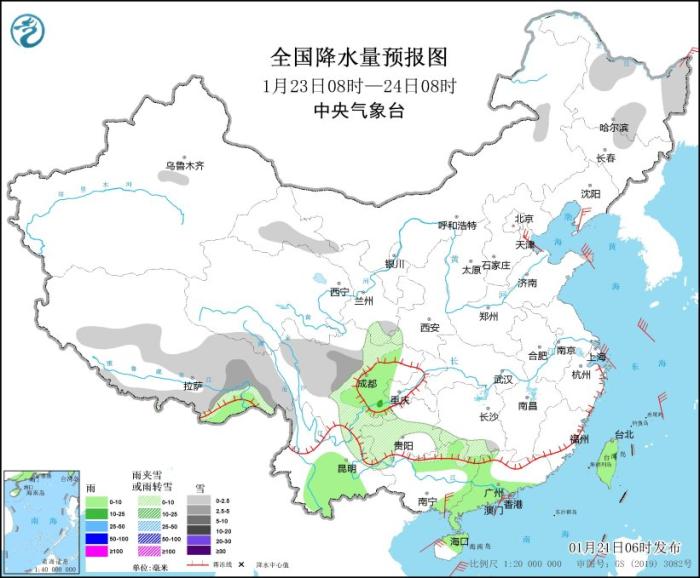 1月21日08時(shí)至22日08時(shí),東北地區(qū)中東部、西藏東部、黃淮東部、西南地區(qū)東部、江漢東部和西部、江南大部、華南北部等地的部分地區(qū)有小到中雪或雨夾雪,其中,湖北西南部、湖南中西部和北部、貴州中東部和西南部、重慶東部等地的部分地區(qū)有大到暴雪,局地有大暴雪(20~22毫米)。西藏東南部、江南東部和南部、四川盆地及西南地區(qū)南部、華南南部和西部、臺(tái)灣島等地的部分地區(qū)有小到中雨。西藏北部、遼東半島、陝西北部、華北北部、山東半島、浙江東部等地的部分地區(qū)有4~6級(jí)風(fēng)。