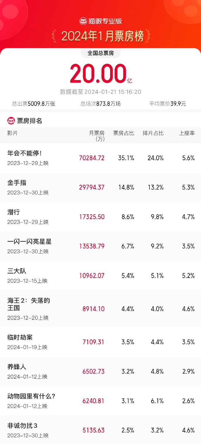 責(zé)任編輯:羅維維 2024年1月總票房破20億