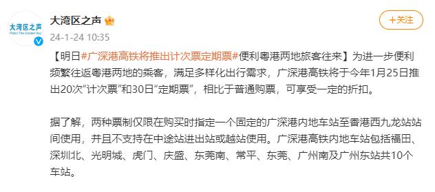 據(jù)@大灣區(qū)之聲 消息,為進(jìn)一步便利頻繁往返粵港兩地的乘客,滿足多樣化出行需求,廣深港高鐵將於今年1月25日推出20次「計(jì)次票」和30日「定期票」,相比於普通購(gòu)票,可享受一定的折扣。