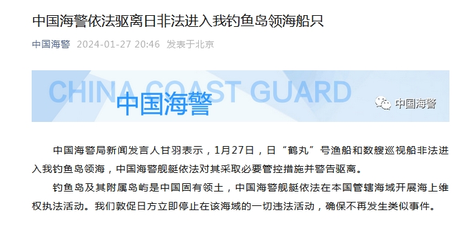 據(jù)中國海警官方微信公眾號27日消息,中國海警局新聞發(fā)言人甘羽表示,1月27日,日「鶴丸」號漁船和數(shù)艘巡視船非法進(jìn)入我釣魚島領(lǐng)海,中國海警艦艇依法對其採取必要管控措施並警告驅(qū)離。