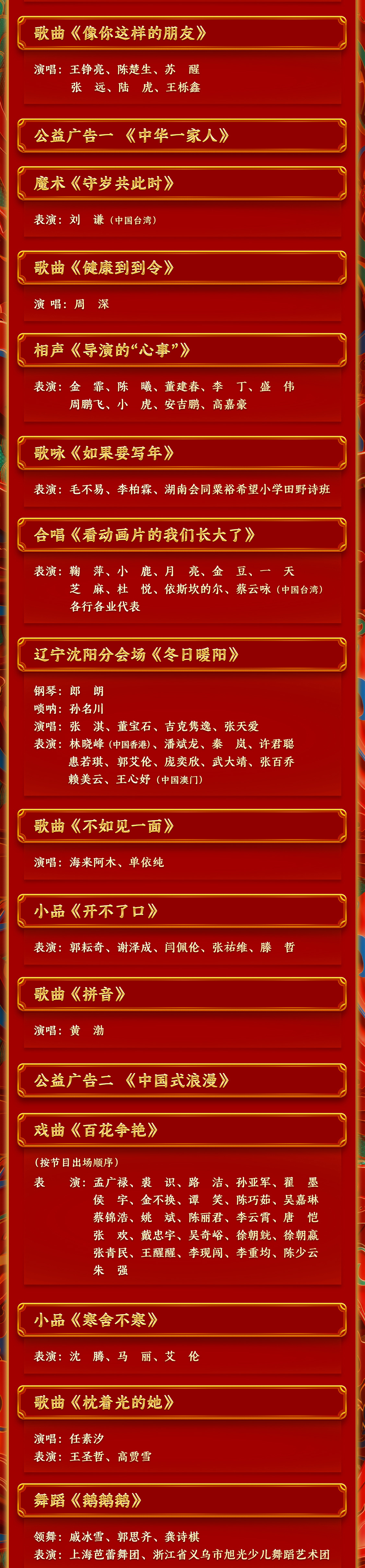 春滿中華,福到萬(wàn)家。中央廣播電視總臺(tái)《2024年春節(jié)聯(lián)歡晚會(huì)》節(jié)目單正式發(fā)布。